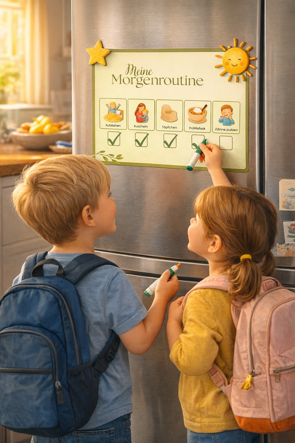 Morgenroutine für Kinder – stressfrei in den Tag starten Mehr Ruhe am Morgen – ohne Schreien, Hetzen und ständiges Erinnern Kennst du diese Morgen, an denen gefühlt schon vor 7 Uhr alles gleichzeitig passiert? 😮‍💨 Ein Kind will sich nicht anziehen.Das andere sitzt seit zehn Minuten vor dem Frühstück.Du suchst die Brotdose, jemand findet den zweiten Schuh nicht – und innerlich bist du eigentlich längst im Zeitdruck. Und noch bevor der Tag überhaupt richtig begonnen hat, fühlt sich schon alles anstrengend an. Wenn dir das bekannt vorkommt: Du bist damit wirklich nicht allein.In vielen Familien sind genau die Morgenstunden die stressigste Zeit des Tages. Nicht unbedingt, weil so viel passieren muss – sondern weil so vieles gleichzeitig im Kopf behalten werden muss. Wer ist schon angezogen?Wer hat schon gegessen?Wo ist die Trinkflasche?Sind die Zähne geputzt?Müssen heute Sportsachen mit?Und warum spielt plötzlich wieder jemand im Schlafanzug auf dem Wohnzimmerboden? 😅 Die gute Nachricht ist: Es muss nicht jeden Morgen so laufen. Eine liebevoll aufgebaute Morgenroutine für Kinder kann helfen, euren Start in den Tag deutlich ruhiger zu machen. Nicht perfekt. Nicht geschniegelt. Nicht wie aus einem Bilderbuch. Aber machbar.Klarer.Und oft wirklich viel entspannter. 🤍 💛 Ein kleines Stück echtes Leben Bei uns kam damals gefühlt alles auf einmal zusammen: ein neues Baby in der Familie – und gleichzeitig der Übergang vom Kindergarten in die Schule. Das war wunderschön, klar. Aber eben auch ziemlich turbulent. Plötzlich hatten wir morgens nicht mehr nur „irgendwie fertig werden“, sondern ganz neue Abläufe: ein Schulkind, das pünktlich losmusste, ein Baby mit ganz eigenem Rhythmus – und ich irgendwo dazwischen mit dem Versuch, Frühstück, Anziehen, Zähneputzen, Buszeit und meine eigenen zwei Hände sinnvoll zu koordinieren. Und ganz ehrlich? Das hat am Anfang überhaupt nicht elegant funktioniert. 😅 Da wurde noch schnell eine Schleichlandschaft zu Ende gebaut, obwohl eigentlich längst Zähneputzen dran war. Sportsachen waren nicht da, wo sie sein sollten. Und ich stand selbst noch im Schlafanzug im Flur und dachte nur: „Wann genau war eigentlich der Moment eingeplant, in dem ich mich fertig mache?“ Was uns gefehlt hat, war keine Motivation. Und auch keine Liebe oder Mühe. Uns hat vor allem eine klare, sichtbare Struktur gefehlt. Genau das war der Wendepunkt. 🌈 Warum Morgende mit Kindern so oft eskalieren Viele Eltern denken zuerst:„Wir müssen einfach konsequenter sein.“ Aber oft liegt das Problem gar nicht daran. Morgende kippen meistens aus ganz anderen Gründen: zu viele Schritte auf einmal zu wenig Zeitpuffer Kinder wissen nicht genau, was als Nächstes kommt Erwachsene erinnern alles mündlich und ständig Geschwister bringen sich gegenseitig durcheinander ein Kind ist noch müde, hungrig oder überfordert abends wurde nichts vorbereitet der Morgen ist insgesamt zu voll Das Entscheidende ist: Kinder funktionieren morgens oft nicht unter Druck besser, sondern eher schlechter. Je mehr Hektik, Diskussionen und ständiges Erinnern in der Luft liegen, desto schwerer fällt vielen Kindern genau das, was eigentlich passieren soll. Eine gute Morgenroutine nimmt deshalb nicht nur Aufgaben ab.Sie nimmt vor allem Unklarheit raus. ✨ 🌼 Warum eine Morgenroutine für Kinder so hilfreich ist Kinder lieben Wiederholungen – selbst dann, wenn sie gleichzeitig protestieren. 😉 Eine feste Morgenroutine gibt ihnen: ✅ Orientierung ✅ Sicherheit ✅ Vorhersehbarkeit ✅ weniger Entscheidungsmomente ✅ mehr Selbstständigkeit Und dir gibt sie: ✅ weniger Stress ✅ weniger ständiges Erinnern ✅ weniger Diskussionen ✅ mehr Überblick ✅ einen ruhigeren Start in den Tag Das Ziel ist nicht, dass morgens alles militärisch abläuft. Es geht nicht um Perfektion. Es geht darum, einen Ablauf zu schaffen, bei dem dein Kind weiß: Was passiert jetzt? Was kommt danach? Was ist schon geschafft? Und genau das macht in vielen Familien einen riesigen Unterschied. 🙌 👶 Morgenroutine nach Alter – was wirklich sinnvoll ist Nicht jede Routine passt zu jedem Kind. Was morgens hilfreich ist, hängt stark vom Alter, vom Temperament und natürlich auch von eurer Familiensituation ab. 🍼 1–3 Jahre: Kleinkinder In diesem Alter geht es noch nicht um Selbstständigkeit im großen Stil, sondern vor allem um Wiederholung und Sicherheit. Hilfreich sind hier: kurze Abläufe immer gleiche Reihenfolge viel Begleitung wenige Schritte einfache Worte oder Bilder Gut funktionieren oft: aufstehen wickeln oder Toilette anziehen frühstücken waschen und Zähne putzen Schuhe anziehen losgehen 👉 Wichtig: Nicht zu viel erwarten. In diesem Alter ist Begleitung der Schlüssel. 🧒 3–6 Jahre: Kindergartenalter Jetzt kann dein Kind schon viel aktiver mitmachen. Genau hier sind visuelle Routinen oft Gold wert. Hilfreich sind: Bilder oder Symbole feste Reihenfolge kleine Wahlmöglichkeiten 1 bis 2 klare Eigenaufgaben Zum Beispiel: selbst ein Shirt auswählen den Schlafanzug wegräumen den Rucksack holen beim Tischdecken helfen Zähneputzen mit Bildkarte abhaken 👉 Fokus: Orientierung und Mitmachen 🎒 Ab 6 Jahren: Grundschule Viele Kinder können jetzt schon mehrere Schritte selbstständig übernehmen – wenn der Ablauf klar ist. Gut geeignet sind: fester Morgenplan Aufgaben mit Verantwortung kleine Checklisten selbstständiges Packen einfacher Dinge klare Reihenfolgen Zum Beispiel: aufstehen und anziehen Bett kurz richten frühstücken Zähne putzen Schulranzen prüfen Trinkflasche einpacken Jacke und Schuhe anziehen 👉 Fokus: Selbstständigkeit und Verlässlichkeit 🛠️ So baut ihr eine Morgenroutine auf, die wirklich funktioniert Damit eine Morgenroutine im echten Familienleben hilft, sollte sie nicht nur schön klingen – sondern praktisch umsetzbar sein. 1. Erst beobachten, dann verändern 👀 Bevor du alles neu planst, schau dir ein paar Morgende