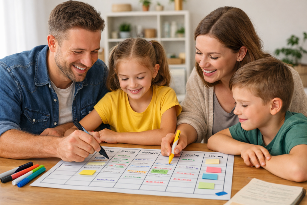Mit Übersicht und Humor: So rockt der Familienwochenplan Weniger Mental Load, weniger Missverständnisse, mehr Ruhe im Familienalltag Montagmorgen. Die Kaffeemaschine läuft, ein Kind sucht hektisch seine Sportsachen, das andere fragt zum dritten Mal, was es heute Nachmittag gibt – und irgendwo dazwischen fällt plötzlich auf, dass da ja noch ein Termin war. Natürlich genau einer von denen, die „eigentlich jemand auf dem Schirm hatte“. 😅 Kommt dir bekannt vor? Dann bist du ganz sicher nicht allein. In vielen Familien entsteht Stress nicht nur durch zu viele Aufgaben, sondern vor allem dadurch, dass ständig jemand an alles denken muss. Termine. Einkäufe. Essensplanung. Schulzettel. Sporttaschen. Fahrdienste. Wäsche. Geburtstage. Kleinkram. Große Dinge. Und oft liegt genau dieses unsichtbare Mitdenken still und leise bei einer Person. Genau hier kann ein Familienwochenplan unglaublich entlastend sein. 💛 Nicht, weil plötzlich alles perfekt läuft.Sondern weil sichtbar wird, was ansteht, wer woran denken muss und was vielleicht noch vorbereitet werden sollte. Gerade wenn zwei Erwachsene mitplanen, sind klare Absprachen Gold wert. Ich kenne das selbst: Mein Partner erzählt mir von einem Termin, den er für nächste Woche ausgemacht hat – und ich habe vielleicht schon vor drei Monaten genau an diesem Tag einen Zahnarzttermin für die Kinder vereinbart. Und plötzlich merkt man: Ohne einen festen Ort, an dem wirklich alles eingetragen wird, plant man schnell aneinander vorbei. Ein guter Familienwochenplan schafft deshalb nicht nur Übersicht. Er kann den Alltag entspannen, Missverständnisse reduzieren, Aufgaben fairer verteilen und Kindern helfen, mehr Orientierung und Selbstständigkeit zu entwickeln. Und ganz ehrlich: Genau das kann im Familienchaos schon ein riesiger Gewinn sein. 🙌 🧩 Was ist ein Familienwochenplan überhaupt? Ein Familienwochenplan ist eine sichtbare Übersicht über alles, was in eurer Woche wichtig ist. Dazu können zum Beispiel gehören: ✅ Termine ✅ Hobbys und Fahrdienste ✅ Einkäufe ✅ Mahlzeiten ✅ Haushaltsaufgaben ✅ Kinderaufgaben ✅ besondere To-dos ✅ gemeinsame Familienzeit Das Ganze kann ganz unterschiedlich aussehen: als Whiteboard in der Küche, als Wochenplan an der Wand, als Ausdruck im Bilderrahmen, als Magnettafel am Schrank oder auch digital. Im Familienalltag funktioniert aber oft besonders gut, was für alle sichtbar ist. Denn genau darum geht es: nicht nur planen, sondern Dinge so festhalten, dass nicht immer alles mündlich erinnert, nachgefragt oder spontan improvisiert werden muss. Bei uns zeigt sich immer wieder: Sobald Termine nur „kurz erzählt“ werden, wird es schnell unübersichtlich. Ein gemeinsamer Ort für alle Einträge macht deshalb oft schon einen riesigen Unterschied. 💛 Warum ein Familienwochenplan so entlastend sein kann Ein Familienwochenplan hilft vor allem dann, wenn euer Alltag sich oft voll, unübersichtlich oder mental anstrengend anfühlt. Besonders hilfreich ist er, wenn: ständig jemand fragen muss, was heute noch ansteht Termine schnell untergehen Aufgaben unklar verteilt sind ein Elternteil gefühlt an alles denken muss Kinder Orientierung brauchen ihr euch mehr Ruhe und weniger spontane Hektik wünscht Der große Vorteil ist: Der Plan holt Dinge aus dem Kopf in die Sichtbarkeit. Und allein das kann unglaublich entlastend sein. ✨ Denn oft sind nicht nur die Aufgaben selbst anstrengend, sondern dieses ständige Mitdenken im Hintergrund:Wer denkt an den Elternbrief?Wer weiß, wann Sportsachen gewaschen werden müssen?Wer merkt, dass die Brotdosen-Zutaten fast leer sind?Wer hat auf dem Schirm, dass am Donnerstag Fahrdienst ist? Ein Familienwochenplan nimmt euch diese Aufgaben nicht komplett ab. Aber er macht sie sichtbar, greifbar und besser verteilbar. Und manchmal sind es genau solche kleinen Systeme, die dafür sorgen, dass nicht immer alles gleichzeitig eskaliert. Ergänzend kann deshalb auch eine 15-Minuten-Aufräumroutine für Familien im Alltag super hilfreich sein. 📝 Was alles in einen Familienwochenplan hinein kann Je nach Familienalltag kann euer Wochenplan unterschiedlich aussehen. Sinnvoll sind vor allem diese Bereiche: 📍 1. Termine und Aktivitäten Zum Beispiel: Schule und Kindergarten Arzttermine Sport Musikunterricht Spielverabredungen Elternabende Ausflüge Hier reicht oft schon die wichtigste Info: Wann? Wer? Was muss dafür vorbereitet werden? 🍽️ 2. Mahlzeiten und Einkäufe Das spart jeden Tag dieselbe Frage:„Was essen wir heute eigentlich?“ Ihr könnt grob eintragen: was gekocht wird wann eingekauft wird wer einkauft ob etwas vorbereitet werden muss Das muss kein perfekter Essensplan sein. Schon ein grober Überblick nimmt enorm viel Druck raus. 🧺 3. Haushalt und Alltagsorganisation Zum Beispiel: Wäsche Müll Bad putzen Staubsaugen Vorräte prüfen Brotdosen vorbereiten Wichtig ist nicht, alles minutiös einzutragen. Es reicht oft völlig, die Dinge sichtbar zu machen, die sonst gerne untergehen oder bei denen Zuständigkeiten unklar sind. 👧 4. Kinderaufgaben Je nach Alter können Kinder kleine feste Aufgaben übernehmen, zum Beispiel: Tisch decken Ranzen kontrollieren Jacke und Schuhe bereitlegen Zimmer kurz aufräumen Pflanzen gießen Sporttasche mit vorbereiten Wenn du Kinder dabei spielerisch an kleine Aufgaben heranführen möchtest, passt hier auch dein Beitrag zum Kinder-Putzplan richtig gut dazu. 🌈 5. Familienzeit und Freiraum Ein guter Familienwochenplan besteht nicht nur aus Pflichten. Auch schöne Dinge dürfen sichtbar Platz bekommen. Zum Beispiel: Spieleabend Ausflug Vorlesezeit freier Nachmittag Besuch bei Oma und Opa Gerade das macht den Plan oft viel freundlicher und realistischer. Und wenn du bewusst mehr schöne gemeinsame Momente einplanen möchtest, findest du in meinem Beitrag über [Familienzeit ohne Geld] viele einfache Ideen für den Alltag. 🛠️ So erstellt ihr euren Familienwochenplan Schritt für Schritt D