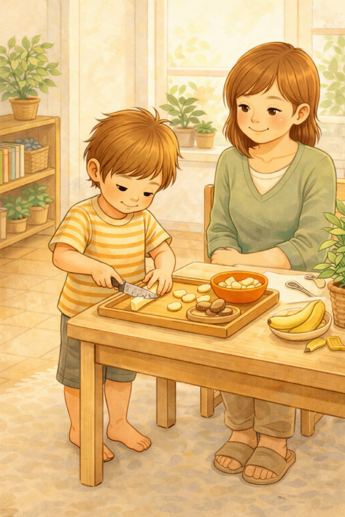 • Beim Obst schneiden entwickelt es Feinmotorik, Sicherheit und echtes Zutrauen.